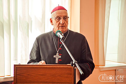 Выказваю вялікую радасць з прысутнасці на гэтым мерапрыемстве прадстаўнікоў іншых веравызнанняў, у першую чаргу Праваслаўнай Царквы, прадстаўнікоў дзяржаўных уладаў г. Магілёва і Магілёўскай вобласці, людзей свету культуры і навукі. Гэта знак добрых міжканфесійных адносін, а таксама знак адкрытасці грамадства на духоўнасць і плённага супрацоўніцтва паміж Касцёлам і дзяржавай.