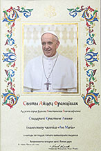Падзячная Грамата З нагоды афіцыйнага Рыма-каталіцкага выдання на беларускай мове «ПЯЦІКНІЖЖА МАЙСЕЯ» Узнагароджваецца Выдавецтва «Про Хрысто» за адданаю шматгадовую працу по пашырэнні Божага слова на Беларускай мове дзеля духоўнага дабра Касцёла і Айчыны