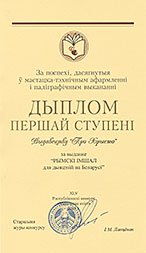 ў мастацка-тэхнічным афармленні і паліграфічным выкананні Д Ы П Л О М ДРУГОЙ СТУПЕНІ Выдавецтву “Про Хрысто” за выданне альбома “FIDEI TESTIS”. “Сведка веры” XLV Рэспубліканскі конкурс «Мастацтва кнігі» 2005 г. |