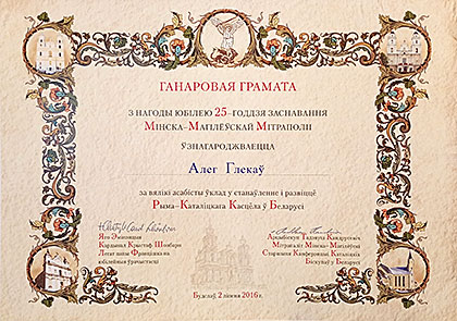 Святары, кансэкраваныя асобы і свецкія вернікі – прадстаўнікі ўсіх дыяцэзій Беларусі – з нагоды урачыстасцяў 25-годдзя заснавання Мінска-Магілёўскай мітраполіі атрымалі з рук папскага пасланніка кардынала Крыстафа Шонбарна OP ганаровыя граматы за ўклад у станаўленне і развіццё Каталіцкага Касцёла ў Беларусі.