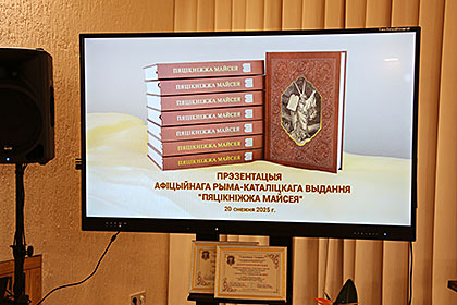 Напрыканцы прэзентацыі біскуп Аляксандр Яшэўскі ўрачыста прадставіў надрукаванае выданне «Пяцікніжжа Майсея» (Мінск, 2025) і разам з ксяндзом Янам Крэмісам уручыў ганаровым гасцям першыя экзэмпляры кнігі.