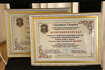 Фінальным акордам сустрэчы стала ўзнагароджанне ганаровымі граматамі Секцыі па перакладзе літургічных тэкстаў і афіцыйных дакументаў Касцёла Камісіі Божага Культу і Дысцыпліны Сакрамэнтаў пры Канферэнцыі Каталіцкіх Біскупаў Беларусі і архідыяцэзіяльнага выдавецтва «Pro Christo», чыя адданая праца зрабіла магчымым выданне «Пяцікніжжа Майсея» і правядзенне гэтай урачыстай і знакавай падзеі.